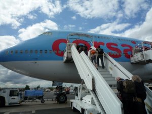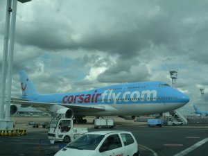 Après avoir parcourus au moins 3 kilomètres à travers l'aéroport le bus s'immobilise. Nous descendons, Marine prend une photo de notre avion et se fait rouspéter par l'agent (au moins on en aura une de notre vrai avion, vous pouvez admirer la photo interdite).