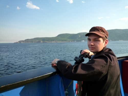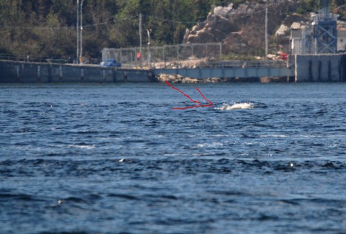 Mais ça bouge là bas... mais c'est noir... mais...mais...c'est un petit rorqual !!!!!!!! Le traversier à peine arrêté qu'on sort pour aussitôt se garer sur le côté et allez voir ça de plus prés!!! Et là furtif moment, presque irréel, une nageoire dorsale qui se dresse au milieu des vagues, un bref instant mais assez pour être subjugué !!! (pas assez pour une photo par contre...) C'est vraiment énorme, et encore c'est une des plus petite espèce pouvant être observer hormis le béluga!!!